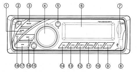 在收音状态,短按此键为波段转换(FM1-FM2-FM3),长按此键为自动搜索电台,并将搜索到的电台按顺序存储在预置按键1-6内;自动搜索电台一遍后,自动播放第一个预置按键所存储的电台节目。每一波段可存储6个电台,共可存储18个电台。
